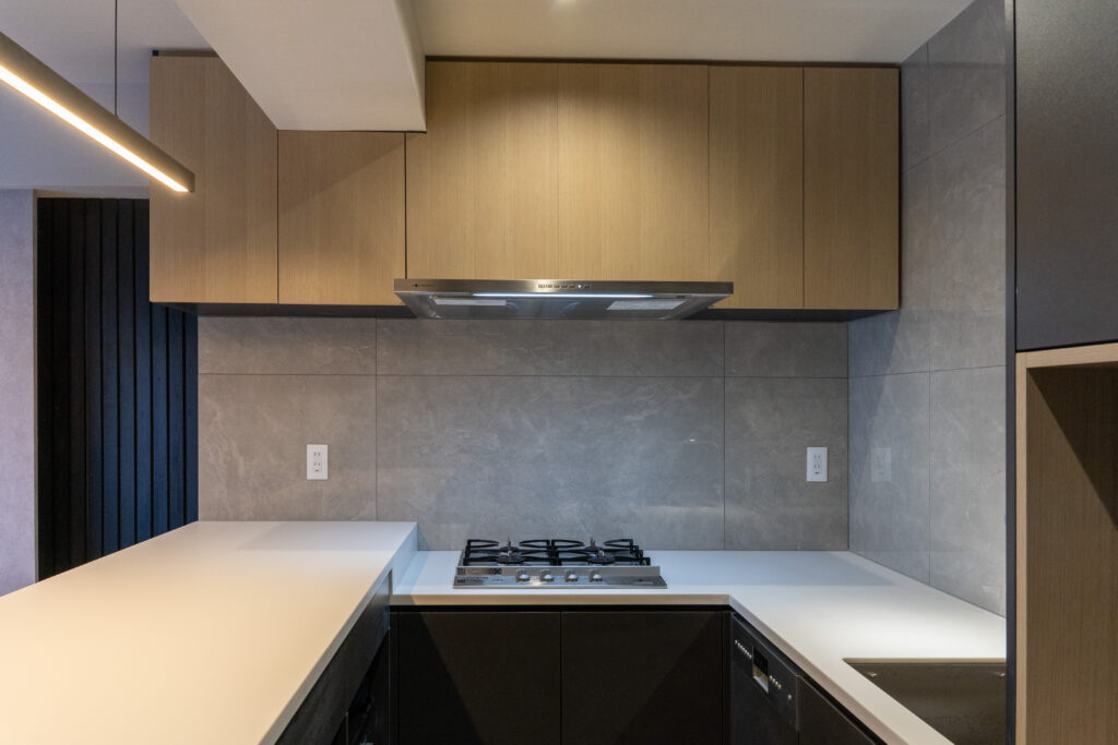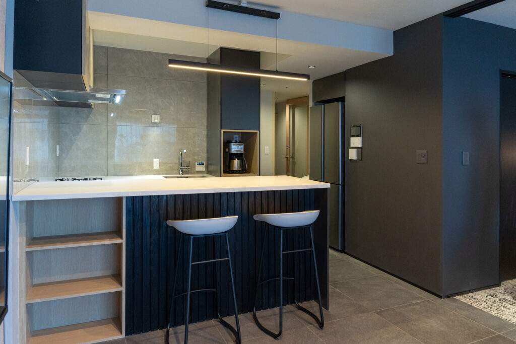 扉材は低圧メラミンのダークグレー色を基調に、ポイントで木目を採用し、シンプルながらも上質で落ち着いた雰囲気に。木目は空間の統一感を出すために室内建具の色に調色して合わせています。コーナー部分にはディスプレイ棚を造作し、インテリアのアクセントにもなっています。