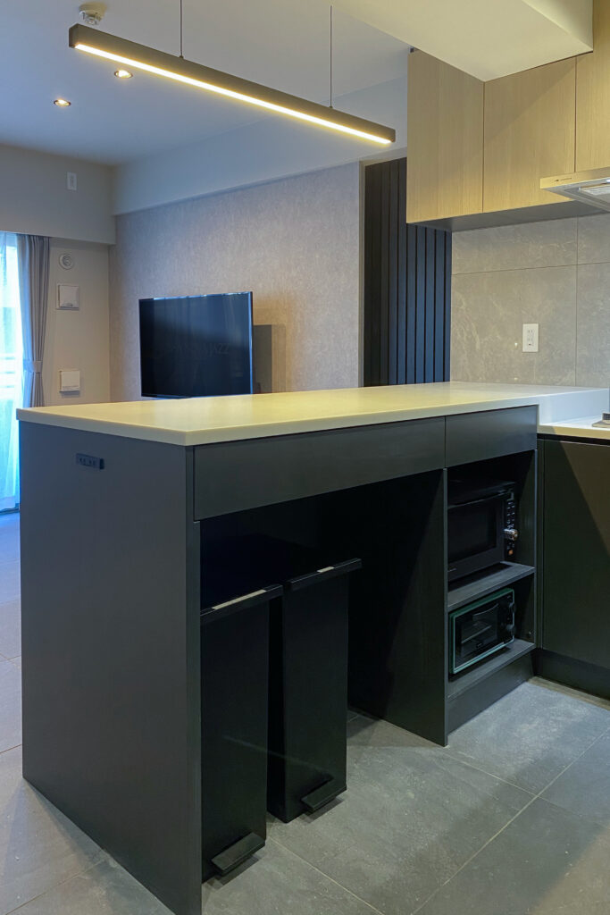 ごちゃごちゃしやすいキッチン家電・ゴミ箱はカウンター下に配置。 使いやすさと見た目のすっきり感を両立しています。