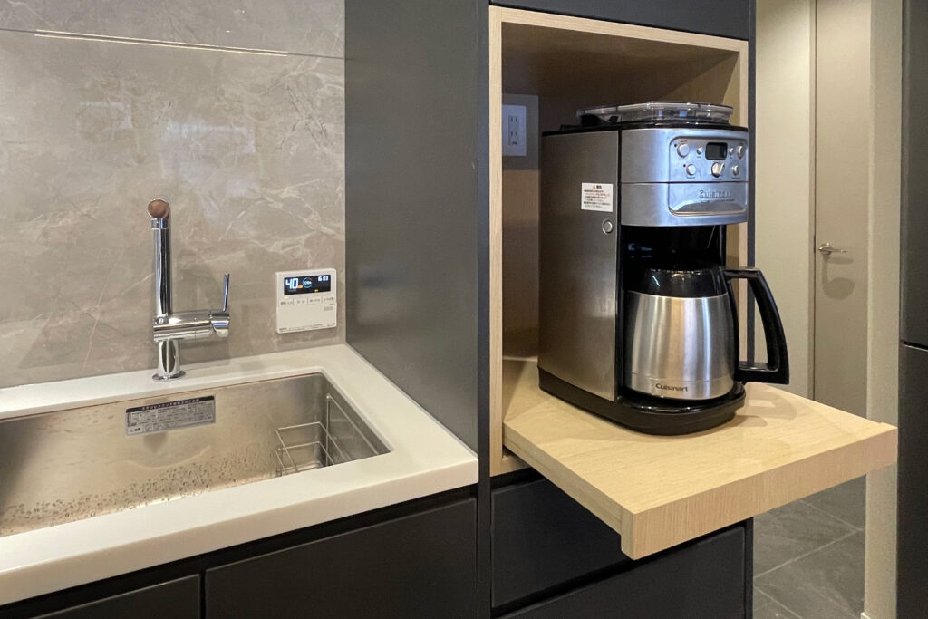 シンク横の家電収納はカウンター高さに合わせて引き出せる使いやすい仕様です。