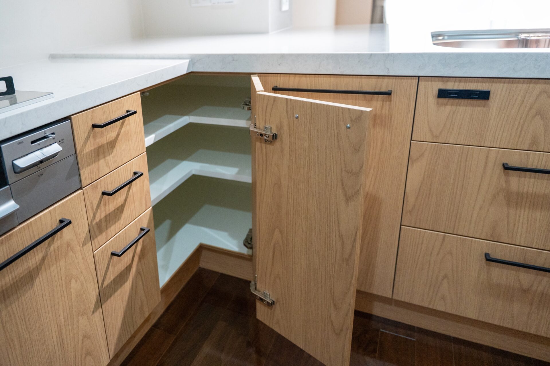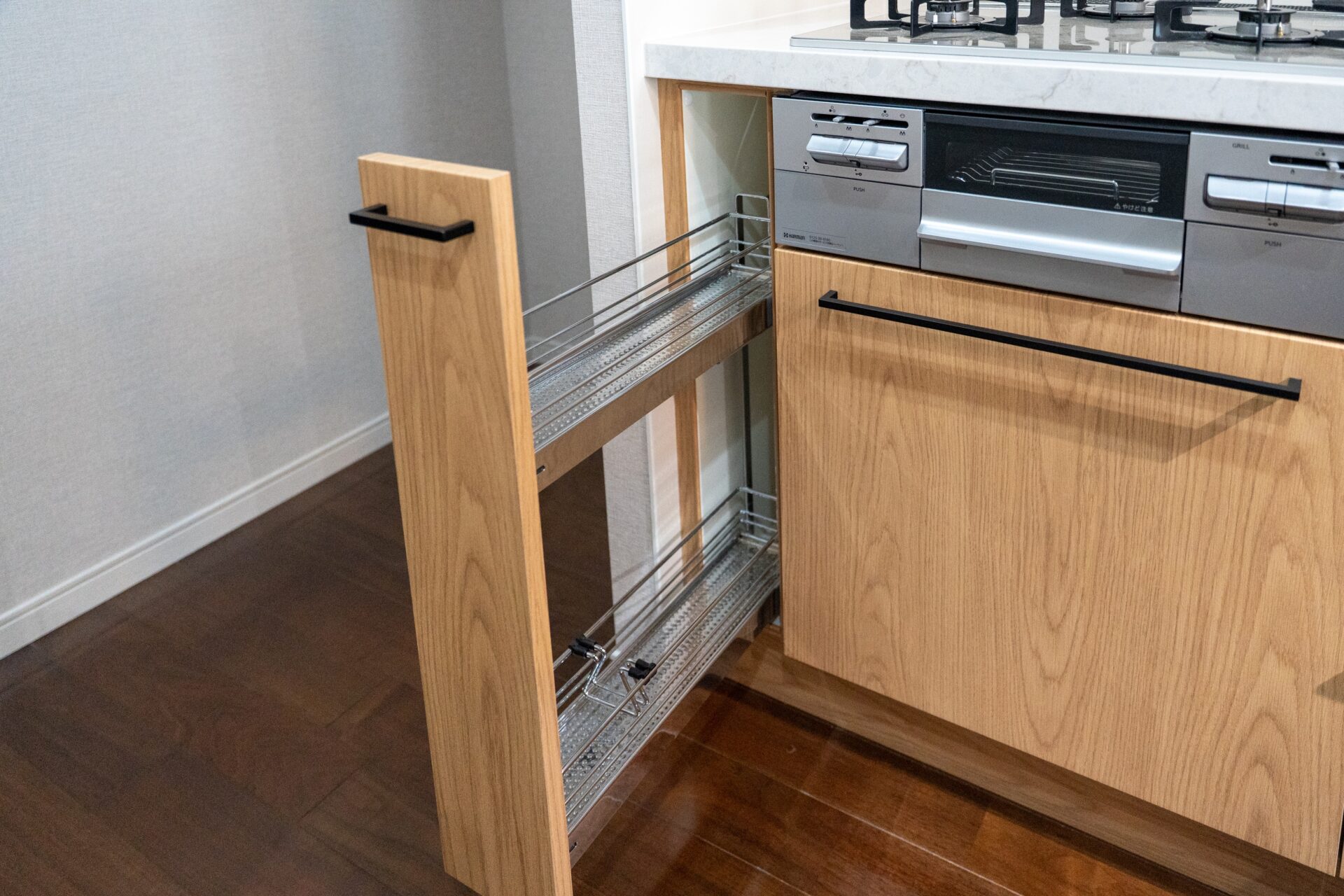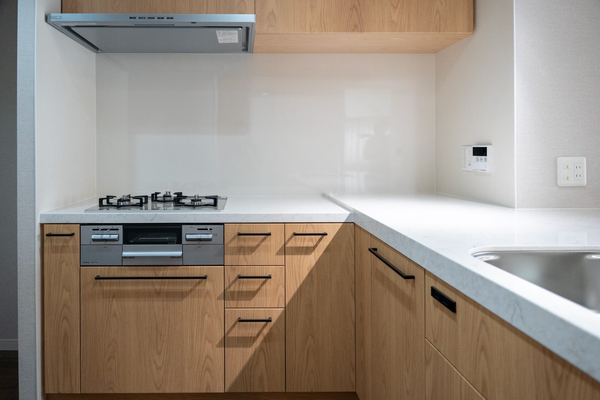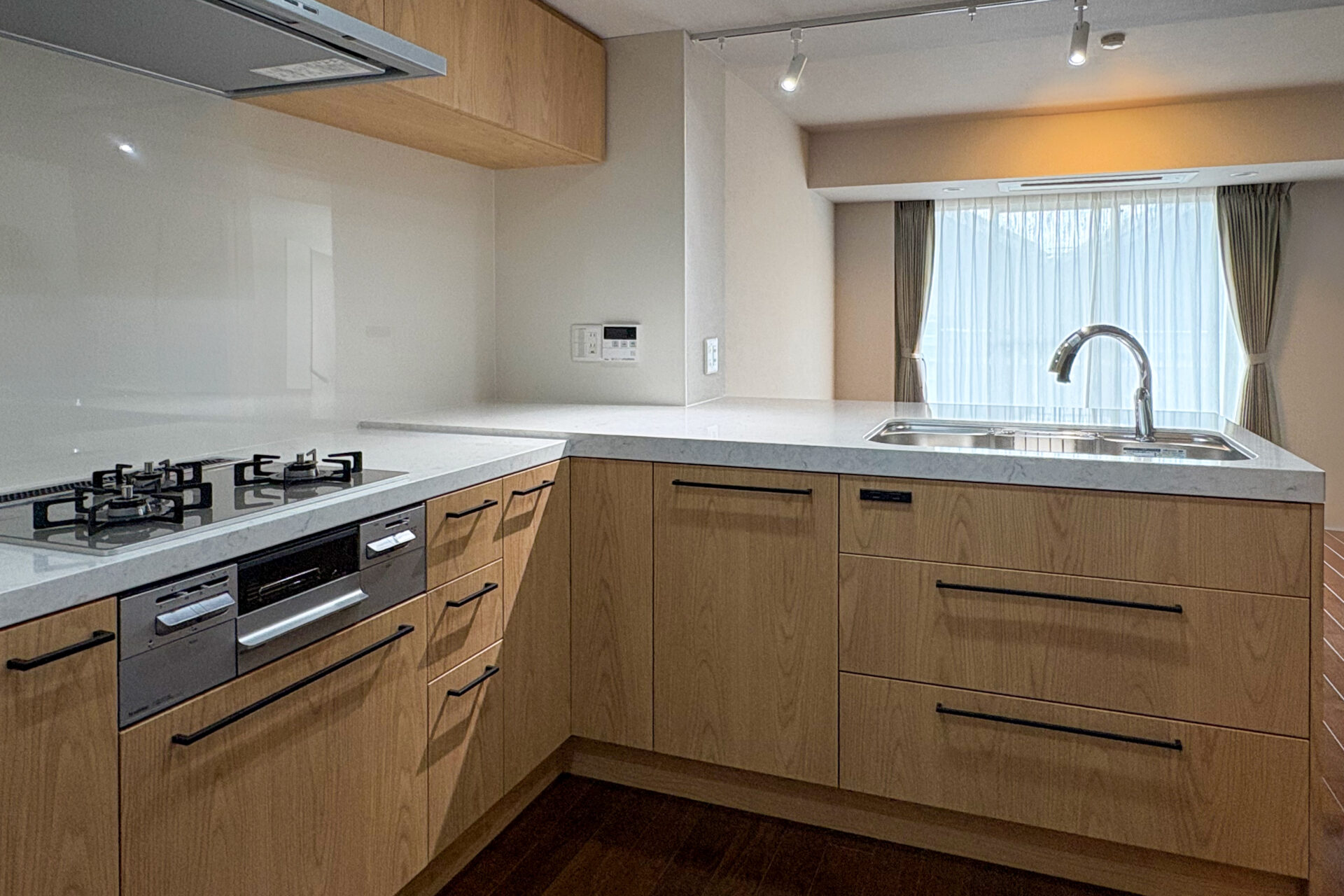 ワークトップはクオーツストーン。シンクとコンロの高さを変えて継ぎ目が目立ちにくいデザインにしています。